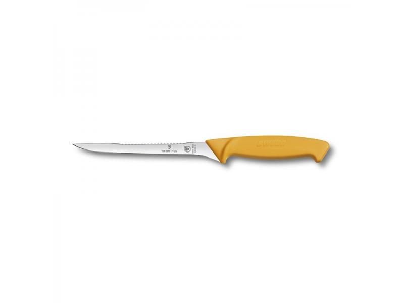 Filetovací nôž na ryby s polypropylénovou rukoväťou a flexibilnou čepeľou dlhou 16 cm. Kuchynský nôž kolekcie Swibo má ergonomicky tvarovanú rukoväť nezameniteľnej žltej farby, ktorá sa mimoriadne ľahko drží a umožňuje jednoduchú manipuláciu. Navyše je vyhotovovaný bez mikropórov a k čepeli pripevňovaný zatavením, vďaka čomu poskytuje optimálnu hygienickú ochranu. Je možné ho sterilizovať až do teploty 120 °C a umývať v umývačke riadu.