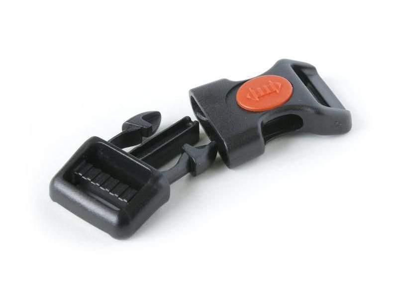 Plastová bezpečnostná spona, ľahko omyvatelná. Posuvné bezpečnostné tlačidlo, ktoré bránia samovoľnému odopnutia. Vhodná k tkaným remeňom šírky 20 mm. Šírka: 20 mm Farba: čierna s červeným tlačidlom. Balenie: obečasti spony